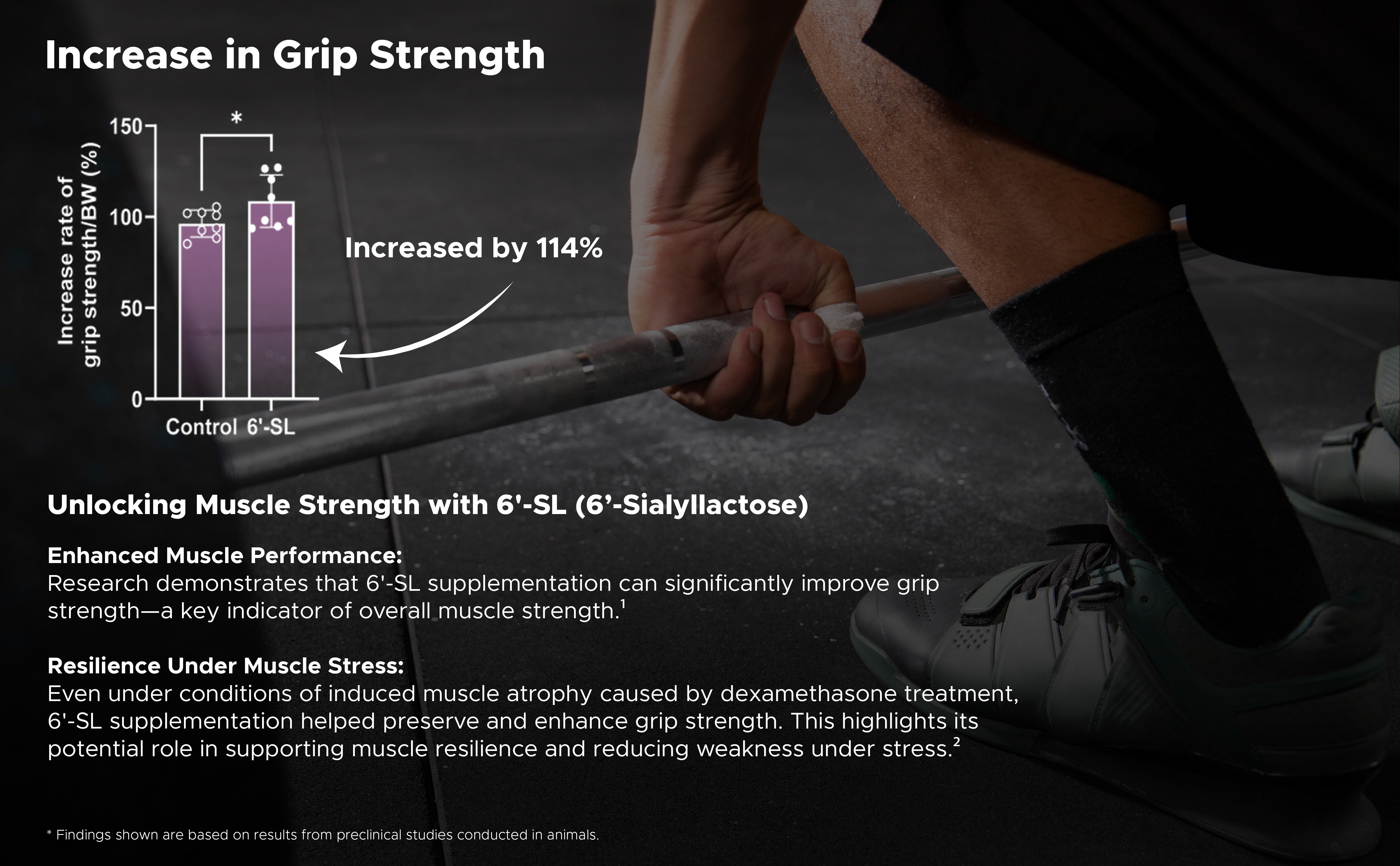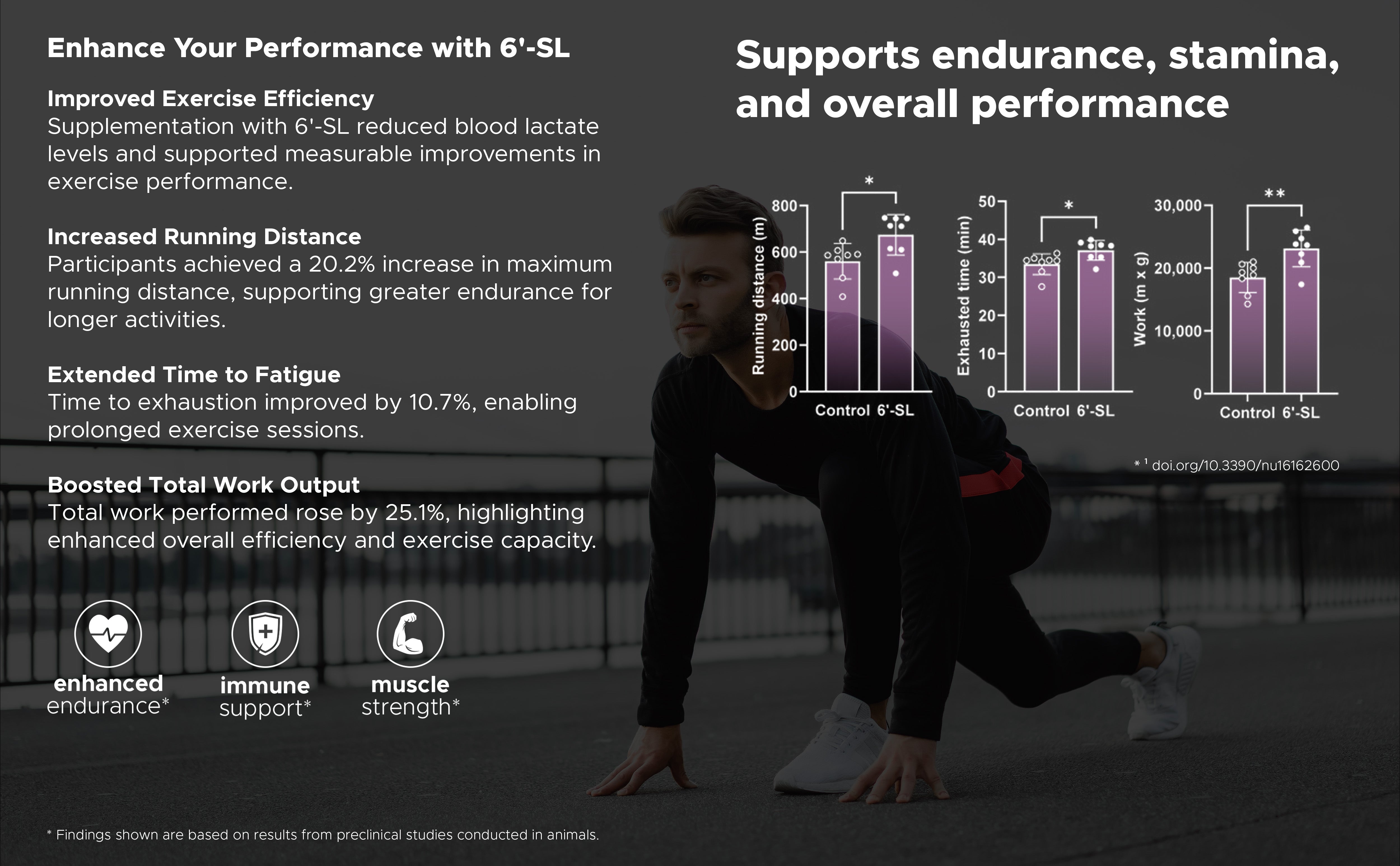 6′-Sialyllactose (6-SL), a human milk oligosaccharide (HMO), may enhance athletic performance by promoting muscle protein synthesis, lowering the buildup of lactate (a key cause of muscle fatigue), and speeding up post-exercise recovery. It also supports a healthy gut microbiome, which plays a vital role in regulating muscle energy use and reducing exercise-related inflammation.